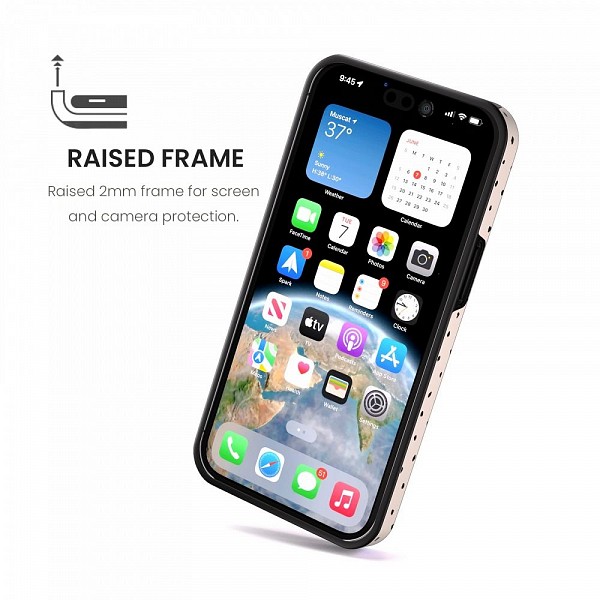 Durch den erhöhten Rand wird der direkte Kontakt zwischen dem Bildschirm und der Oberfläche, auf die das Gerät gelegt wird, verhindert. Dadurch wird das Risiko einer Beschädigung des Displays im Falle eines Sturzes oder Aufpralls reduziert.