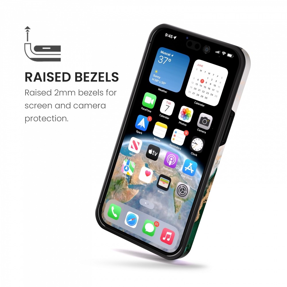 Due to the raised edge, direct contact between the screen and the surface on which the device is placed is prevented. This will reduce the risk of damage to the display in the event of a crash.
